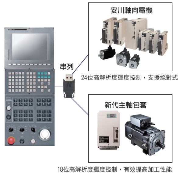 新代21系列控制器支援安川Mechatrolink-II/Mechatrolink-III串列通訊伺服系統(tǒng),通訊頻寬大幅提升到100Mbps,解析度最高可支援到24位元,有效提高加工的平滑性。
