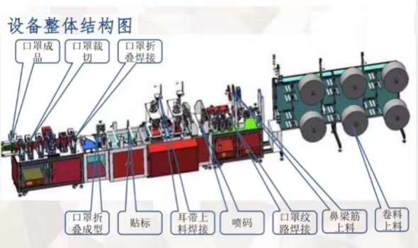 機(jī)型。此全自動(dòng)口罩一體機(jī)主要由多層(最多6層)料卷上料機(jī)構(gòu),鼻線傳送/剪切/填埋機(jī)構(gòu),切片焊