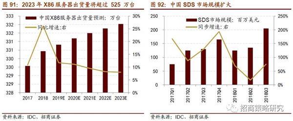服務(wù)器和存儲(chǔ)等云計(jì)算產(chǎn)業(yè)鏈前端設(shè)施逐漸適應(yīng)行業(yè)變革,國(guó)內(nèi)云計(jì)算產(chǎn)能擴(kuò)張已形成模式。根據(jù)IDC發(fā)布的全球服務(wù)器市場(chǎng)報(bào)告,我國(guó)服務(wù)器銷售額增速全球領(lǐng)先,低端X86占據(jù)服務(wù)器市場(chǎng)絕對(duì)優(yōu)勢(shì),高需求帶動(dòng)服務(wù)器價(jià)格攀升,同時(shí)拉動(dòng)了服務(wù)器營(yíng)收增長(zhǎng)。2018 年全年中國(guó) X86 服務(wù)器市場(chǎng)出貨量為3,304,300 臺(tái),同比增長(zhǎng) 26.1%;市場(chǎng)規(guī)模為 171.89 億美元(約合人民幣1,151.95 億元),同比增長(zhǎng) 54.9%。IDC 預(yù)測(cè),到 2023 年中國(guó) X86 服務(wù)器出貨量將超過(guò) 525 萬(wàn)臺(tái),未來(lái) 5 年整體市場(chǎng)年復(fù)合增長(zhǎng)率(CAGR)為 9.7%。