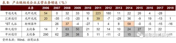由于傳輸網(wǎng)的建設(shè)和無(wú)線網(wǎng)的建設(shè)存在時(shí)間差,傳輸網(wǎng)產(chǎn)業(yè)鏈的受益時(shí)間比無(wú)線網(wǎng)產(chǎn)業(yè)鏈的受益時(shí)間早,主設(shè)備受益時(shí)間持續(xù)時(shí)間較長(zhǎng)。傳輸網(wǎng)主要有光纖、光纜構(gòu)成,因此光纖光纜產(chǎn)業(yè)鏈將在5G建設(shè)周期中首先受益。在運(yùn)營(yíng)商資本傳輸網(wǎng)開支達(dá)增速到峰值前一年,亨通光電和匯源通信的光纖光纜業(yè)務(wù)的營(yíng)業(yè)收入增速最快。無(wú)線網(wǎng)絡(luò)主要有射頻器件構(gòu)成、主要包括濾波器、功率放大器、射頻開關(guān)等射頻器件。在無(wú)線網(wǎng)資本開支增速最快當(dāng)年,國(guó)內(nèi)射頻器件供應(yīng)商*ST凡谷的主營(yíng)業(yè)務(wù)收入增速達(dá)到峰值。主設(shè)備供應(yīng)商的業(yè)務(wù)增長(zhǎng)持續(xù)時(shí)間較長(zhǎng),峰值一般出現(xiàn)在牌照發(fā)放前后一年。
