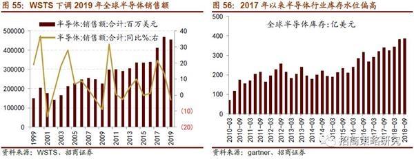 全球半導(dǎo)體行業(yè)庫(kù)存水位偏高,短期去庫(kù)存將影響半導(dǎo)體市場(chǎng)景氣度。2016年,全球存儲(chǔ)器行業(yè)處于上行周期,存儲(chǔ)器價(jià)格在2017年Q3達(dá)到了周期的高點(diǎn),三星、鎂光等存儲(chǔ)器巨頭紛紛擴(kuò)充產(chǎn)能,導(dǎo)致存儲(chǔ)器供過(guò)于求,存儲(chǔ)器價(jià)格持續(xù)走低,拖累全球半導(dǎo)體市場(chǎng)。在2016年Q4之后,全球半導(dǎo)體存貨快速提升,2018年到超過(guò)350億美元,處于歷史較高水平。由于庫(kù)存較高以及需求不及預(yù)期,世界半導(dǎo)體貿(mào)易統(tǒng)計(jì)組織(WSTS)下調(diào)了全球半導(dǎo)體銷售額,將2019年全球半導(dǎo)體預(yù)計(jì)銷售額從4901.42億美元下調(diào)至4545.47億美元,同比增速也從增長(zhǎng)2.6%下調(diào)至下滑3%。