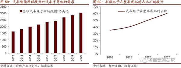 消費(fèi)者提升汽車體驗(yàn)的需求是車載電子快速發(fā)展的直接原因。傳統(tǒng)的汽車動(dòng)力系統(tǒng)、車身與底盤系統(tǒng)的發(fā)展已經(jīng)比較成熟,高級(jí)駕駛輔助系統(tǒng)(ADAS)和信息娛樂(lè)系統(tǒng)成為消費(fèi)關(guān)注重點(diǎn)。ADAS系統(tǒng)和車載信息娛樂(lè)系統(tǒng)依賴于車載信息獲取系統(tǒng)(傳感器)、車載信息傳輸系統(tǒng)(射頻通信部分)、車載信息處理與控制系統(tǒng)(MCU等)、車載信息表達(dá)系統(tǒng)(顯示屏、揚(yáng)聲器等)等半導(dǎo)體元器件。因此車載電子成本成為汽車整車成本的一個(gè)重要的增長(zhǎng)點(diǎn),根據(jù)智研咨詢預(yù)測(cè)2025年車載電子成本將占整車成本60%左右。