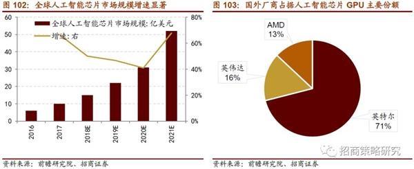 數(shù)據(jù)規(guī)模巨大和算法復(fù)雜度對(duì)芯片的要求越來(lái)越高,運(yùn)算速度和穩(wěn)定性成為芯片研發(fā)的關(guān)鍵指標(biāo)。傳統(tǒng)的CPU芯片無(wú)法高效處理并行計(jì)算,且對(duì)不同的算法,芯片的設(shè)計(jì)要求也不同,定制化芯片應(yīng)運(yùn)而生。目前人工智能芯片市場(chǎng)仍被因特爾和英偉達(dá)等海外巨頭占據(jù)。據(jù)前瞻產(chǎn)業(yè)研究院統(tǒng)計(jì),全球人工智能芯片2021年市場(chǎng)規(guī)模將達(dá)到52億美元,年復(fù)合增長(zhǎng)率達(dá)到53%。國(guó)內(nèi)華為、寒武紀(jì)、阿里巴巴、比特大陸、百度等企業(yè)都在加速研發(fā)可定制化的AI芯片。其中寒武紀(jì)MLU 100PCIe 智能處理卡將于2019年量產(chǎn),比特大陸 SOPHON芯片計(jì)劃于2H19量產(chǎn)。
